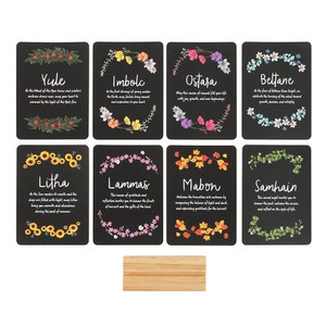 Deze prachtige en handige set van acht altaar kaarten heeft prachtig geïllustreerde ontwerpen die elk van de acht Heksen Sabbats die het Wiel van het Jaar vertegenwoordigen, vergezeld van een natuurlijke houten standaard om gemakkelijk neer te zetten. Perfect voor seizoensgebonden altaren, rituelen of spirituele studie.