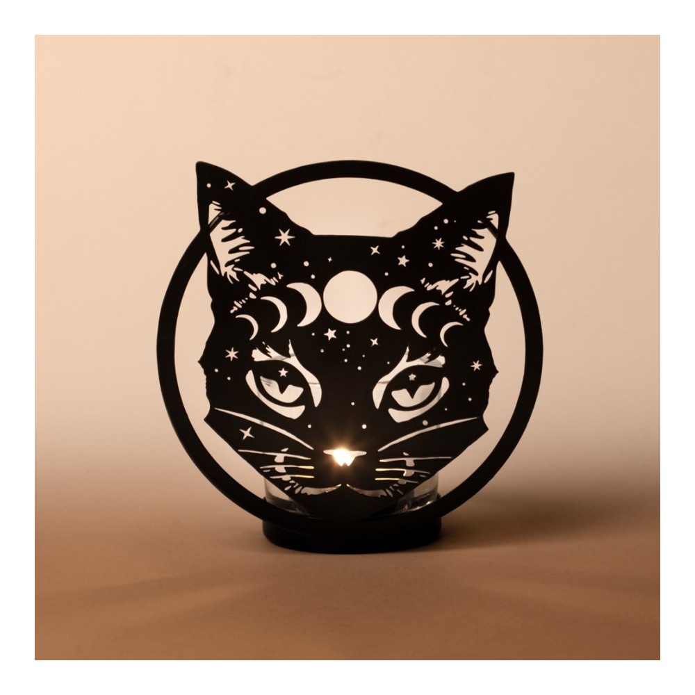 Alchemy Dark Art T-Light houders. Kaarslicht flikkert en jaagt op schaduwen van decoratieve schoonheid terwijl Alchemy's Dark Art T-lights je innerlijke heiligdom doordrenken met een huiselijke sfeer, de duisternis verlichten en je naar de dageraad leiden. Een kaars/T-lamp houder met origineel Alchemy design. Laat het kaarslicht schaduwen van donkere schoonheid over je boudoir werpen. Een magische astrale zwarte kat met maanfasen en bezaaid met kleine sterretjes!
