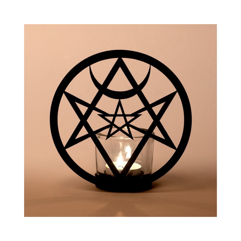 De Unicursal Hex T-light houder is een symbolische samensmelting van kunst, alchemie en verlichting. Het ontwerp is gemaakt van zwart gecoat ijzer en glas en is een eerbetoon aan het oude hermetische sigil dat ooit door 16e-eeuwse filosofen werd vereerd als de figuur van liefde - een symbool van harmonie tussen tegenstellingen. Later overgenomen door occultist Aleister Crowley, ging het unicursale hexagram de macrokosmos vertegenwoordigen: de goddelijke eenheid van elementaire en planetaire krachten. Of je nu een heilig altaar plaatst, sfeer oproept in je rituele ruimte, of gewoon je huis versiert met krachtige symboliek, deze kandelaar dient als een baken voor de spiritueel afgestemde.